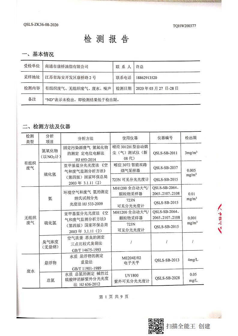 南通市康橋油脂有限公司4月份環(huán)境檢測(cè)報(bào)告